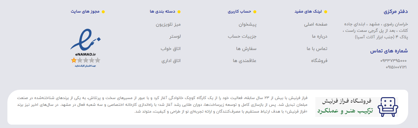 فروشگاه FarazFurnish برای افزایش اعتبار و اعتماد مشتریان در فضای آنلاین، اقدام به دریافت اینماد (نماد اعتماد الکترونیکی) کرده است تا کاربران با اطمینان بیشتری خرید اینترنتی خود را انجام دهند و از قانونی بودن فروشگاه مطمئن باشند.