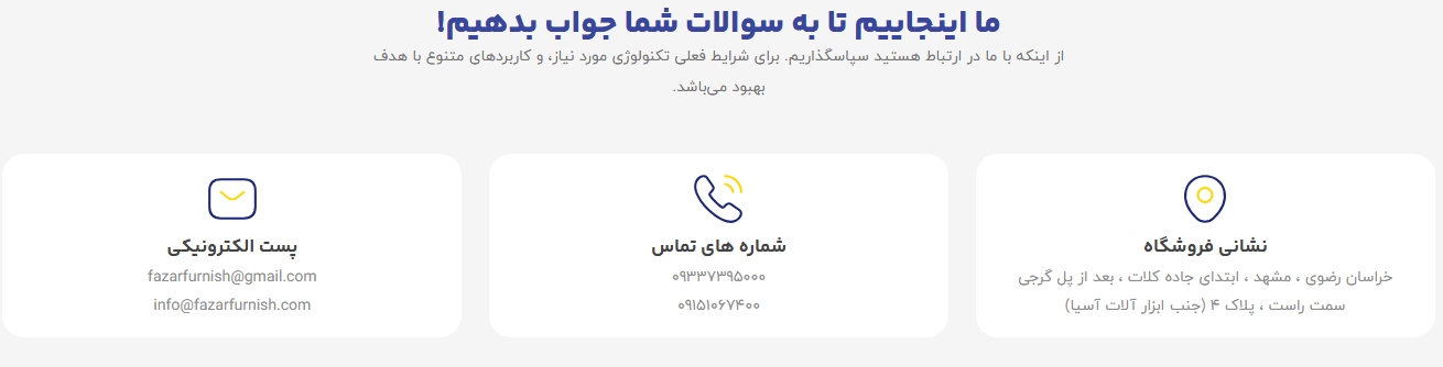 سایت FarazFurnish.ir یک فروشگاه اینترنتی مبلمان و لوازم اداری و خانگی است که با ارائه محصولات متنوع و باکیفیت، انتخابی مناسب برای تجهیز فضاهای کاری و منزل میباشد. این فروشگاه با بیش از دو دهه تجربه در صنعت تولید مبلمان، سعی دارد با ارائه کالاهای استاندارد، قیمت مناسب و خدمات حرفهای خرید آنلاین را برای مشتریان ساده و مطمئن کند. کاربران میتوانند انواع میز، صندلی، مبلمان، لوستر، و دیگر محصولات دکوراسیون را مشاهده، انتخاب و سفارش دهند.
